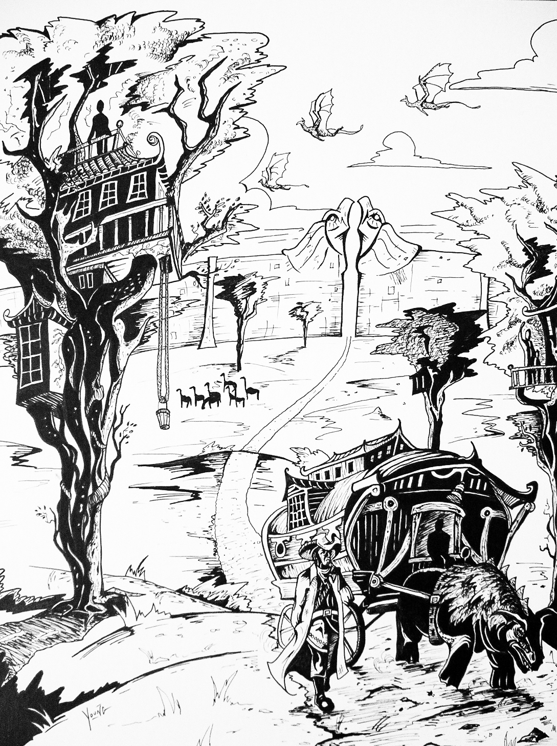 This is an illustration inspired by the sci-fi novel series, Renegades of Pern, by Anne McCaffrey.Ink & gouache on illustration board